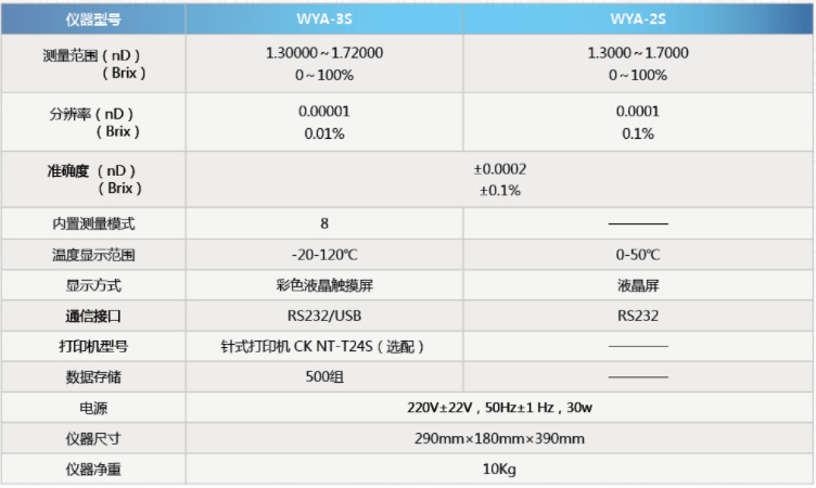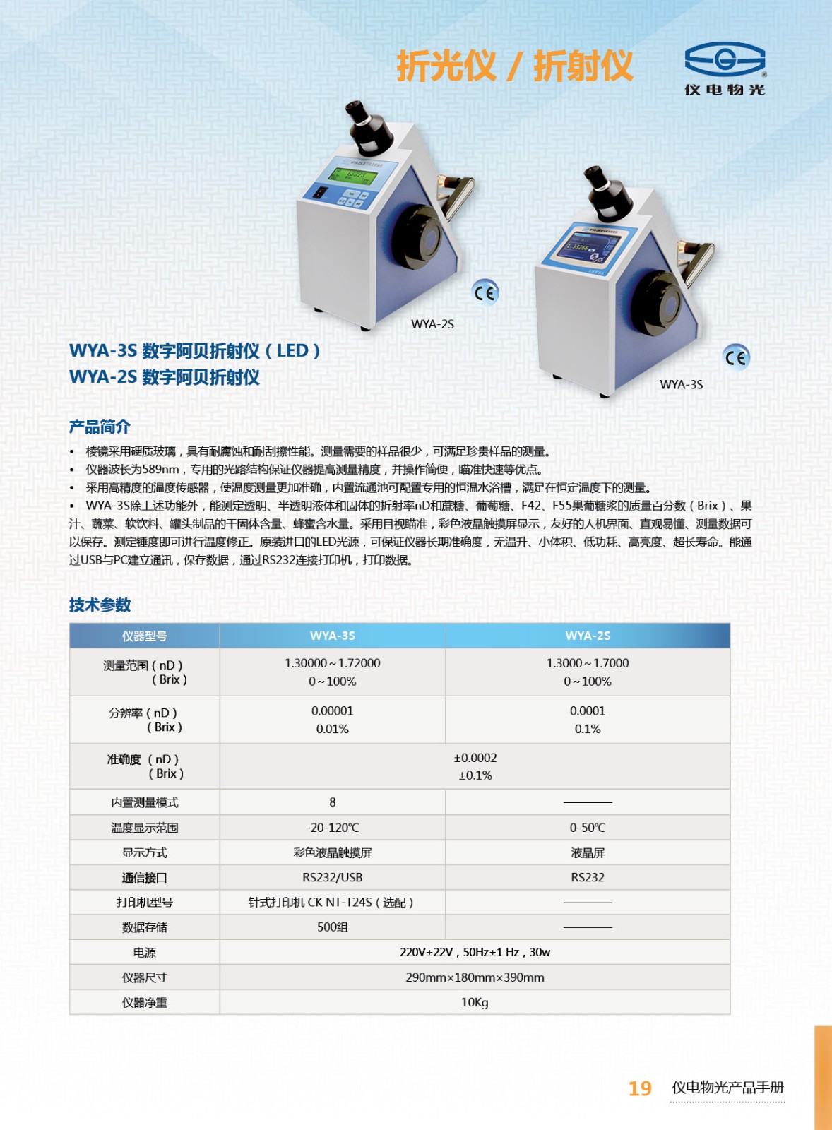 WYA-3S除上述功能外,能測定透明、半透明液體和固體的折射率nD和蔗糖、葡萄糖、F42、F55果葡糖漿的質(zhì)量百分數(shù)(Brix)、果汁、蔬菜、軟飲料、罐頭制品的干因體含量、蜂蜜含水量。采用目視瞄準,彩色液晶觸摸屏顯示,友好的人機界面、直觀易懂、測量數(shù)據(jù)可以保存。測定錘度即可進行溫度修正,原裝進口的LED光源,可保證儀器長期準確度,無溫升、小體積、低功耗、高亮度、超長壽命。能通過USB與PC建立通訊,保存數(shù)據(jù),通過RS232連接打印機,打印數(shù)據(jù)。