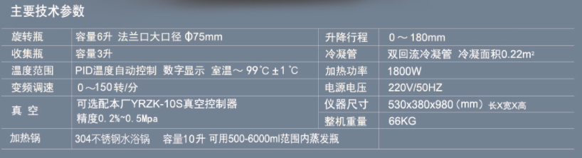 | 關(guān)鍵字 | 旋 轉(zhuǎn) 瓶 容量6L 收 集 瓶容量3L雙回流冷凝管 室溫-99度±1度 變頻調(diào)速0-150轉(zhuǎn)/分行程0-180MM,功率1.8KW |
