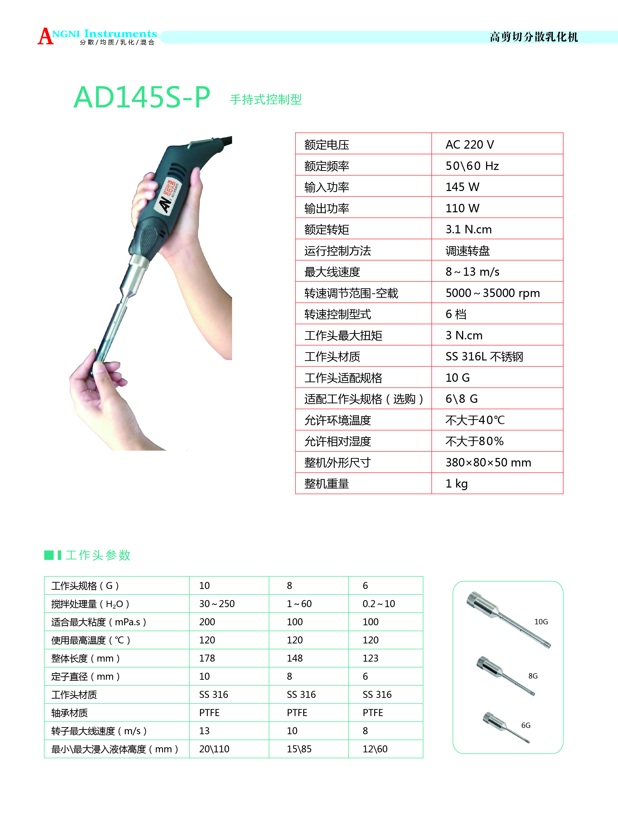 | 關(guān)鍵字 | 轉(zhuǎn)速調(diào)節(jié)范圍:5000-35000rpm,輸出功率:110W,輸入功率:145W;轉(zhuǎn)速控制形式:6檔,工作頭規(guī)格:10G;直徑:10mm,處理量:30-250ml |