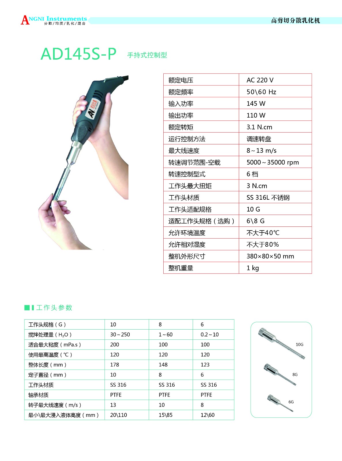 AD145S-P超細(xì)勻漿機(jī)適用于液體/液體的混合、乳化、均質(zhì),液體/固體粉未的分散,組織細(xì)胞搗碎、漿化等實(shí)驗(yàn)。