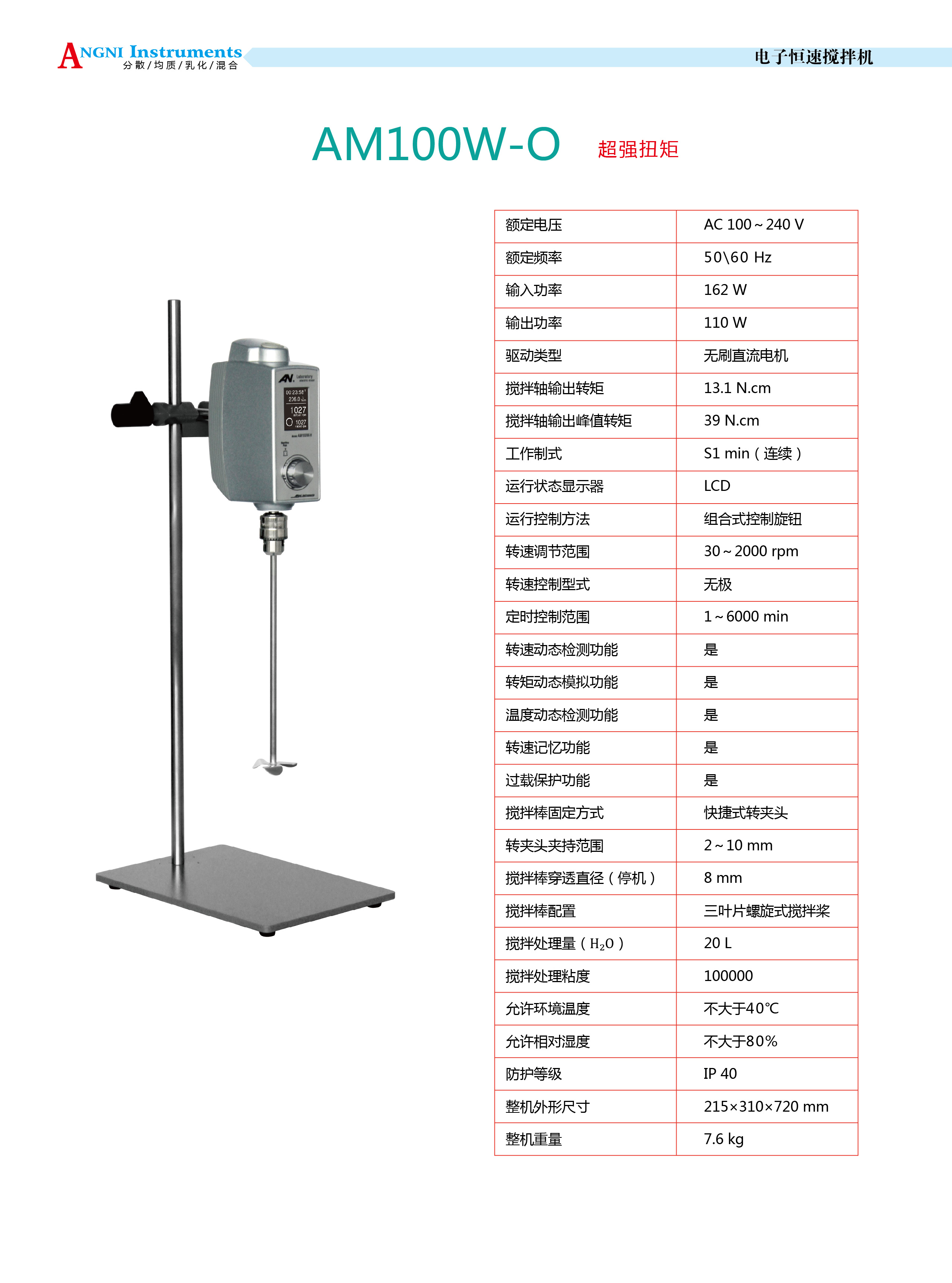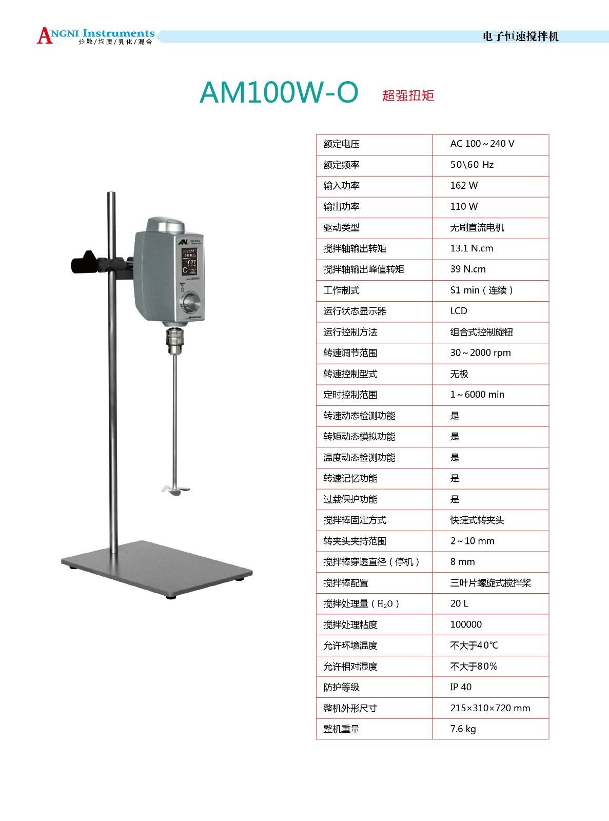 AM100W-O電子恒速攪拌機(jī)采用大功率高轉(zhuǎn)矩直流無碳刷電機(jī)驅(qū)動(dòng),適用于實(shí)驗(yàn)室低至中、高粘度液體的混合攪拌。