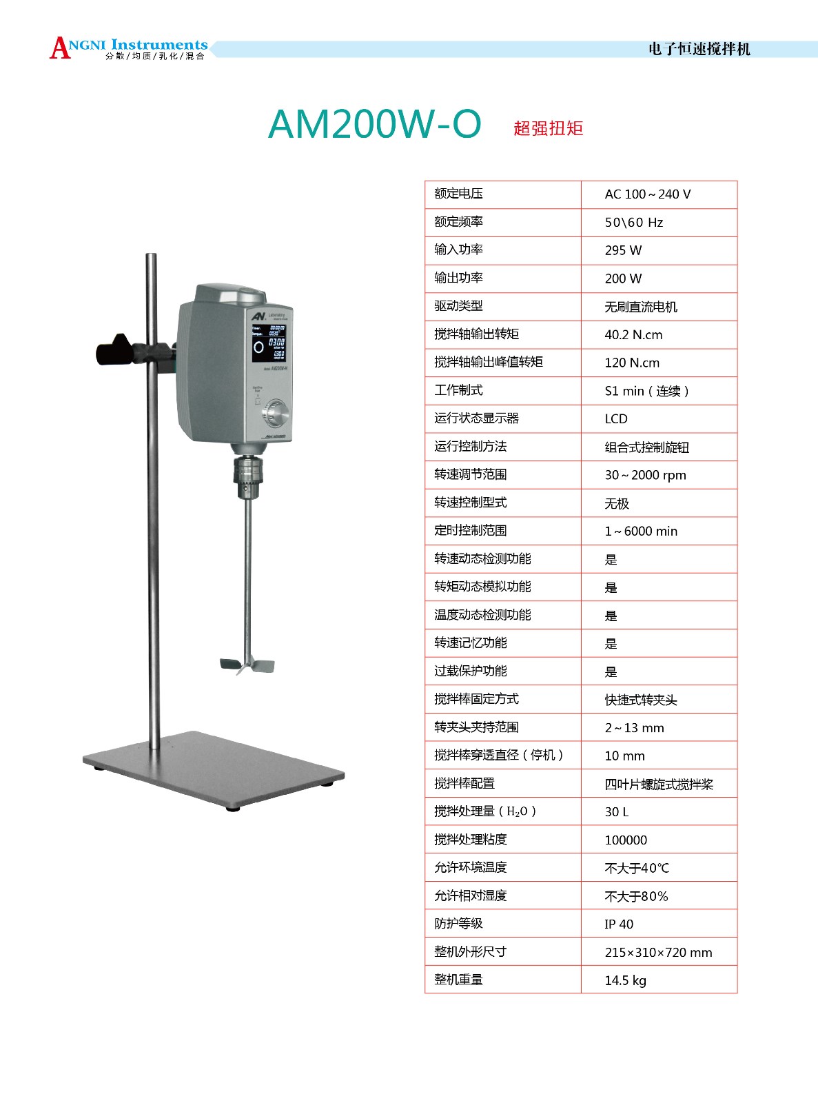 AM200W-O電子恒速攪拌機(jī)采用大功率高轉(zhuǎn)矩直流無(wú)碳刷電機(jī)驅(qū)動(dòng),適用于實(shí)驗(yàn)室低至中、高粘度液體的混合攪拌。