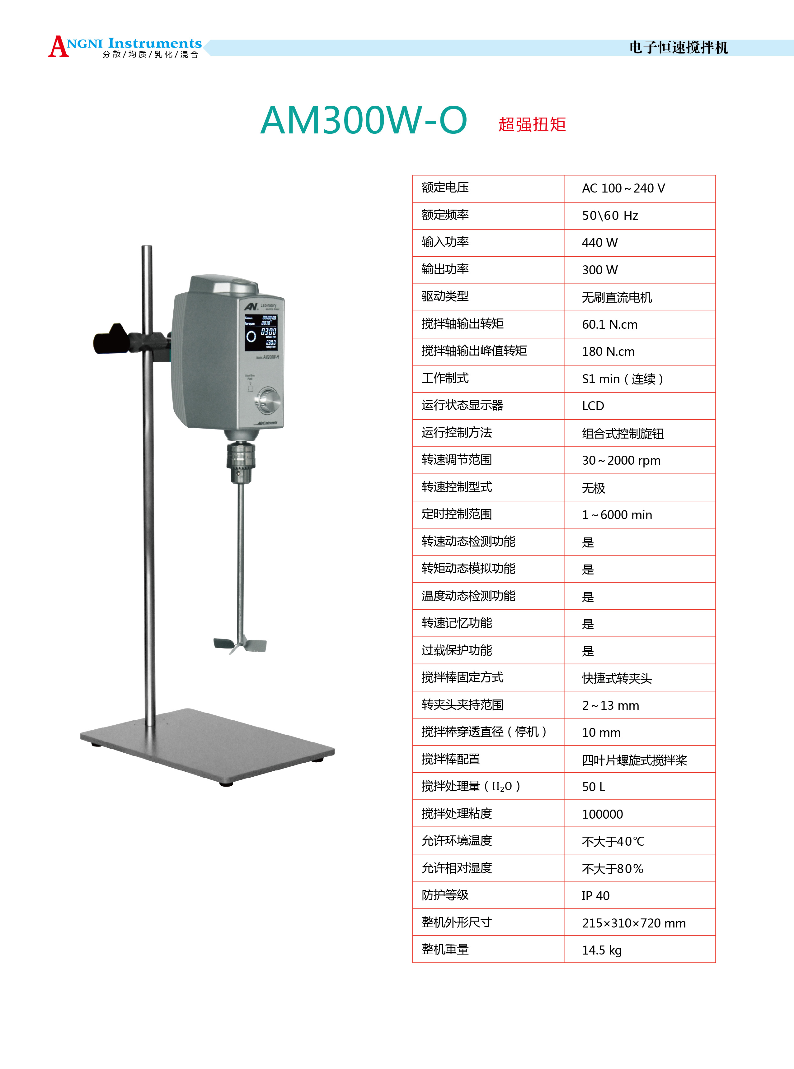 AM300W-O電子恒速攪拌機(jī)采用大功率高轉(zhuǎn)矩直流無(wú)碳刷電機(jī)驅(qū)動(dòng),適用于實(shí)驗(yàn)室低至中、高粘度液體的混合攪拌。