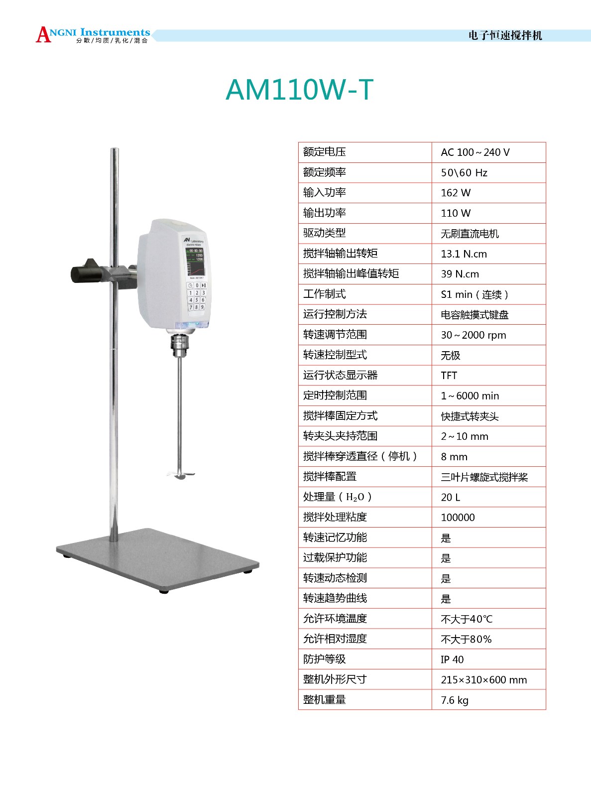 AM110W-T電子恒速攪拌機采用無碳刷直流電機驅動,適用于實驗室低至中、高粘度液體的攪拌混合。