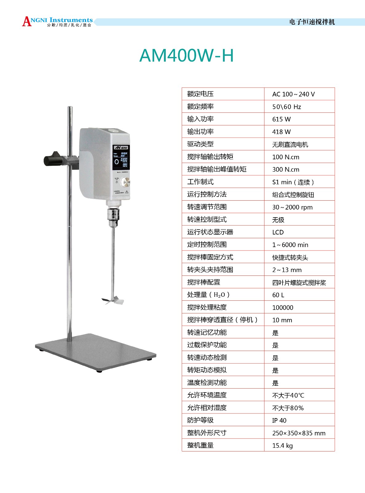 AM400 W-H 實驗室電子恒速攪拌機(jī)采用大功率高轉(zhuǎn)矩直流無碳刷電機(jī)驅(qū)動,適用于實驗室低至中、高粘度液體的混合攪拌。