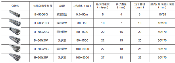 處理量范圍(ml,H2O) | 100ml-5000ml(分散B-500/25G) | 100ml-5000ml(分散頭B-500/25F) |