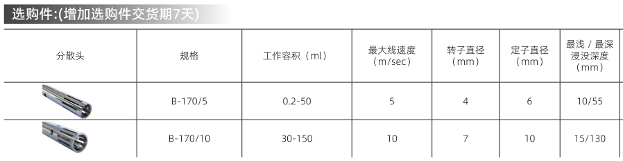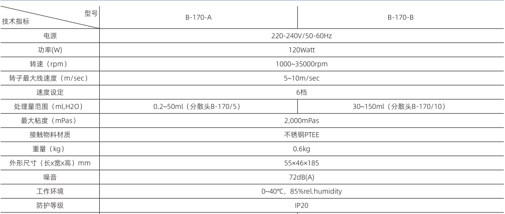 | 關(guān)鍵字 | 處理量范圍:0.2-50ml(分散頭B-170/5) 轉(zhuǎn)速:1000-35000rmp 最大粘度:2000mpas |