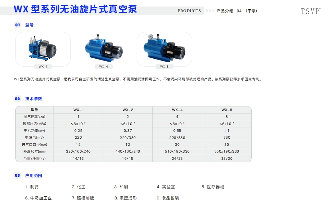 WX型系列無油旋片式真空泵,是我公司自主研發(fā)的清潔型真空泵,不需用油潤滑即可工作,不會(huì)污染環(huán)境即被處理的產(chǎn)品。適合真空干燥、真空濃縮作業(yè),可廣泛用于制藥、化工、食品包裝、醫(yī)療器械、牛奶加工業(yè)、印刷、照相制版、吸塑成形和實(shí)驗(yàn)室等廣泛領(lǐng)域。該泵獲得國家專利(專利號:90302753.4)。