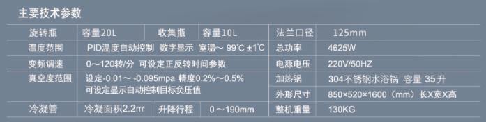 | 關鍵字 | 旋轉瓶容量20L收集瓶10L 變頻調速:0-120轉/分 溫度控制:PID溫度自動控制 數字顯示 室溫-99度±1度 升降行程:0-190mm |