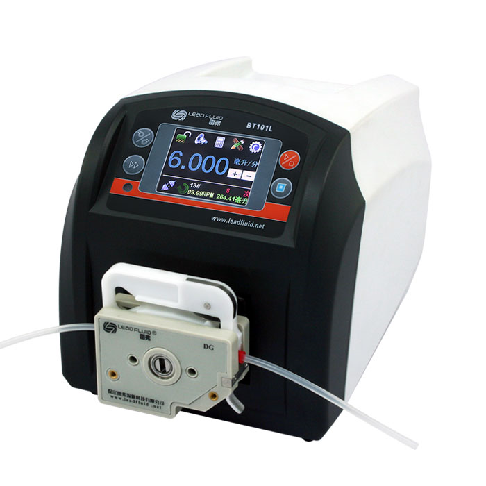 BT101L流量型智能蠕動(dòng)泵流量范圍0.00011~720毫升/分鐘。采用彩色液晶和觸摸屏技術(shù),操作界面簡(jiǎn)單,直觀,明了。主要適用于精準(zhǔn)流量傳輸控制,用戶可以根據(jù)自己的需要流量顯示,流量控制,流量累計(jì)。同時(shí)本產(chǎn)品實(shí)現(xiàn)了重復(fù)定時(shí)定量傳輸。適用于精確計(jì)量和定量給料,精度最高可達(dá)0.5%,為了減小不必要的蠕動(dòng)泵噪音,采用了智能溫控技術(shù)。在RS485通訊中,因?yàn)椴捎昧薓ODBUS協(xié)議,更易于與其他控制設(shè)備如計(jì)算機(jī),人機(jī)界面,PLC等連接。