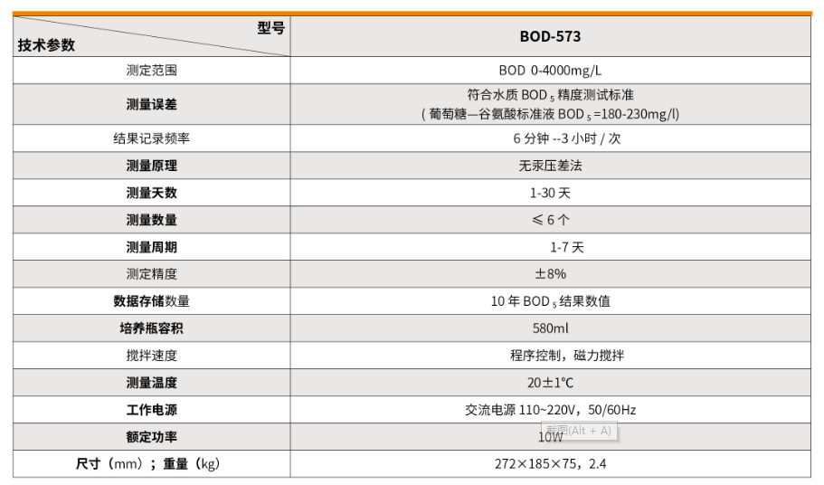 | 關(guān)鍵字 | 測(cè)量范圍:0-4000mg/L 測(cè)量原理:無(wú)汞壓差法 培養(yǎng)瓶容積:580ml 測(cè)量溫度:20±1℃ |