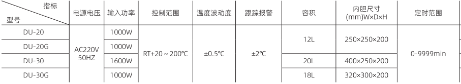 | 關(guān)鍵字 | 容積:12L 工作室尺寸:250×250×200mm 控溫范圍:RT+20~200℃ |