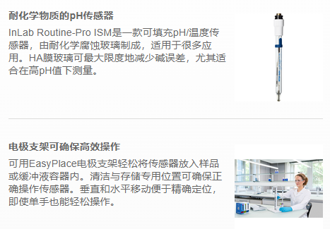 SD50 pH/離子儀,配備通用型InLab Routine-Pro ISM pH/溫度傳感器,具有自動(dòng)傳感器識(shí)別功能。該套件包括一個(gè)高效的電極支架和pH緩沖液袋,用于初始校準(zhǔn)。