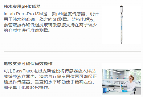 SD50 pH/離子儀,配備InLab Pure-Pro ISM pH/溫度傳感器,用于純水的pH測量,具有自動傳感器識別功能。該套件包括一個(gè)高效的電極支架和pH緩沖液袋,用于初始校準(zhǔn)。