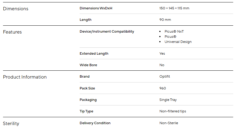 The non-filtered Optifit Tips are designed for best possible fitting and sealing to secure the highest possible accuracy and precision. These pipette tips enable ergonomic and light tip attachment by being compatible with the Optiload feature in Sartorius Picus? Nxt, Picus?, Tacta?, Mline? and Proline? Plus pipettes.