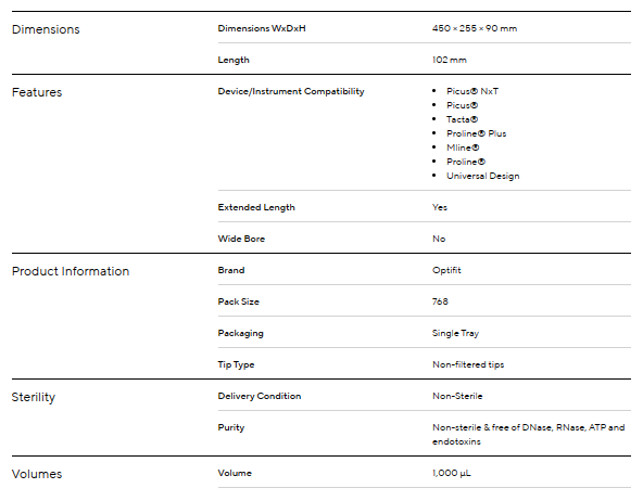 The non-filtered Optifit Tips are designed for best possible fitting and sealing to secure the highest possible accuracy and precision. These pipette tips enable ergonomic and light tip attachment by being compatible with the Optiload feature in Sartorius Picus? Nxt, Picus?, Tacta?, Mline? and Proline? Plus pipettes.