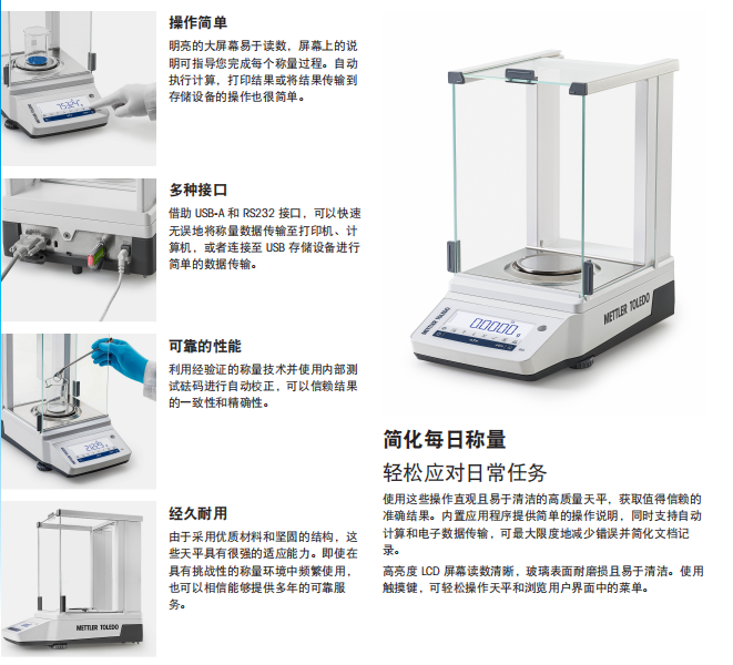 數(shù)據(jù)管理: 2 個(gè)接口:USB-A、RS232; 藍(lán)牙選件 ;重量傳輸功能可輕松傳輸數(shù)據(jù); MT-SICS EasyDirect ;天平軟件