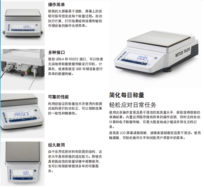 高效操作: LCD 混合觸摸屏; 內(nèi)置 10 種應(yīng)用程序; 統(tǒng)計數(shù)據(jù)分; 用于在天平下方稱量的掛鉤; 即插即用