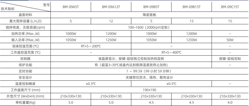 ● 加熱磁力攪拌器:B系列僅控制盤面溫度,可達(dá)400℃,包含C機(jī)型的功能;