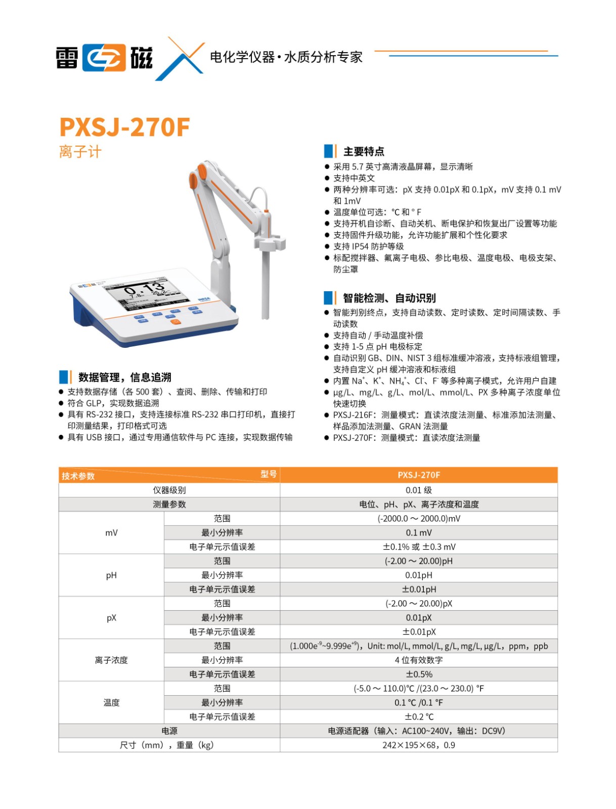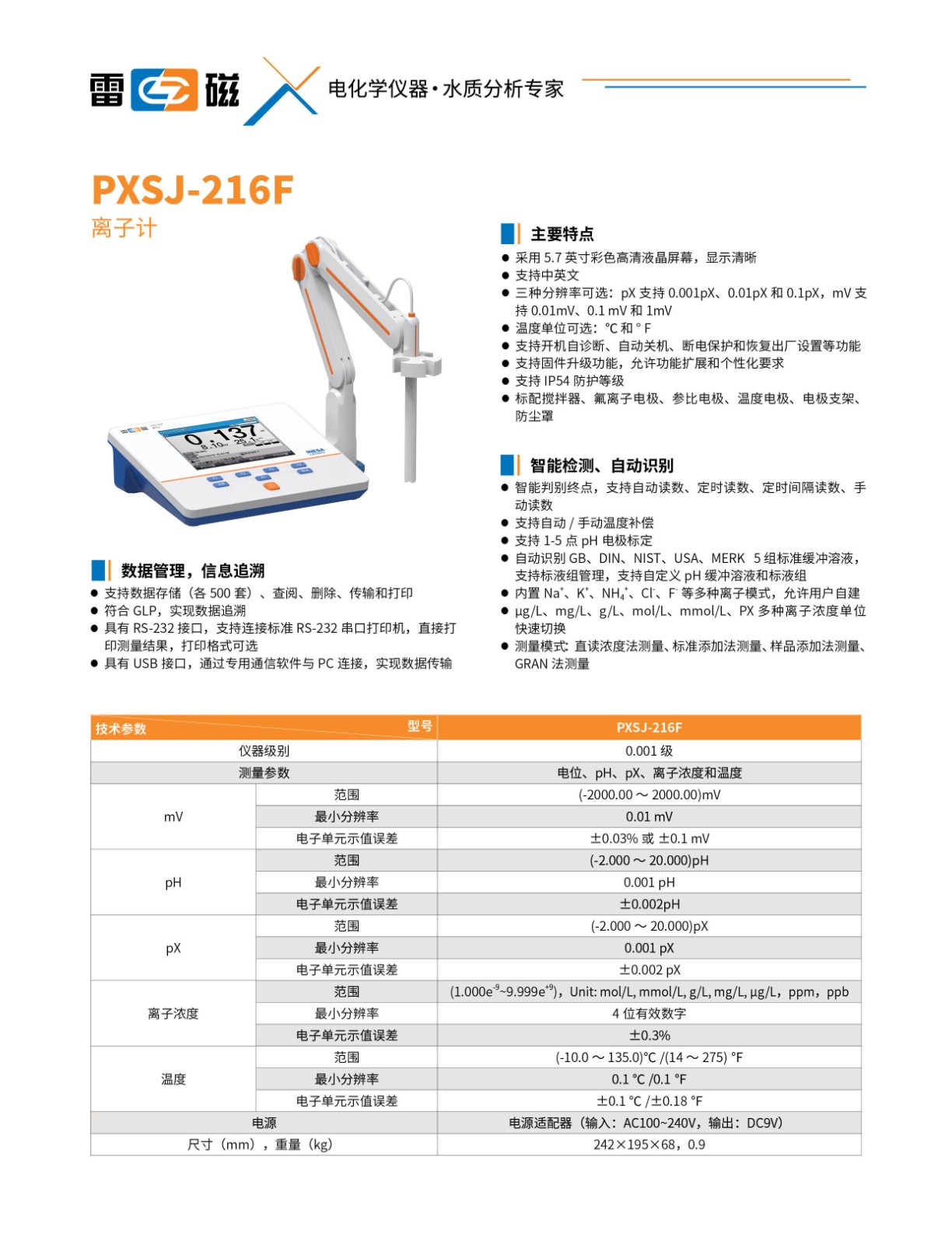 范圍:0.00~14.00pX,精度:±0.01pX;(-1999~1999)mV